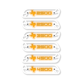 You've been waiting and they are finally here! LED and Non-LED 'Texas' 2019-2025 5th gen Ram® HD replacement hood emblems, made from stainless steel and powder coated. These badges add a custom touch to you truck and stand out day or night with LED letters.