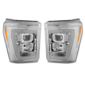 RECON Projector Headlights, specifically designed for 2011-2016 Ford Super Duty trucks. Featuring Ultra High Power Smooth OLED Halos and DRLs, these headlights offer superior illumination and a stylish appearance. The set includes H7 bulbs for low beams and H1 bulbs for high beams. If desired, you can easily upgrade to RECON LED Bulbs for ultimate visibility.