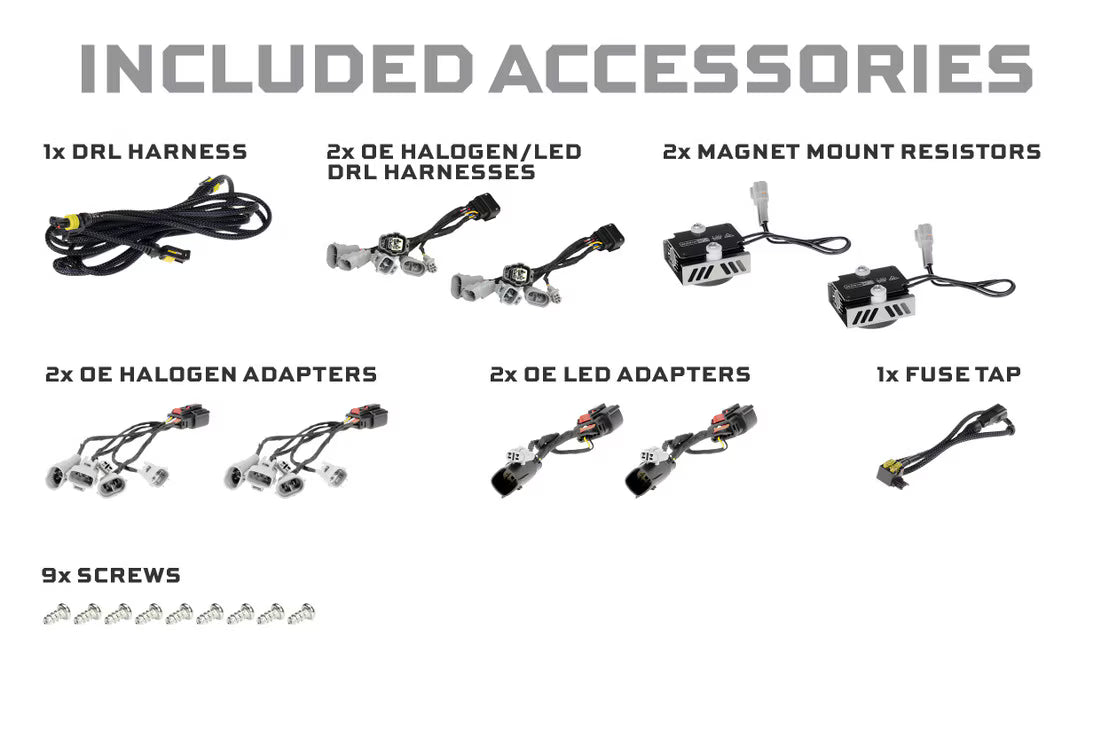 Accessories: 2x Halogen Adapters, 2x OEM LED Adapters, 1x DRL Harness, 2x Magnet Mount Resistors, 1x DRL Harness, 9x Screws, Fuse Tap Hardware