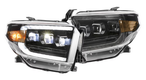 The Morimoto XB LED Headlights for the 14-21 Toyota Tundras. These headlights are designed to elevate your driving experience with a significant boost in light output. They feature a unique triple-projector setup, utilizing all three projectors for low beam and a dual Bi-LED configuration, delivering 33% more light in low beam mode and a whopping 100% increase in high beam mode. But it's not just about brightness -- the Morimoto Gen II lights also offer a captivating start-up sequence and are DOT approved, meeting and exceeding all necessary regulations. Installation is hassle-free with a plug-and-play design, and they even include necessary connectors, rubber seals, and pigtails. Choose between white or all-amber Sequential LED DRL options to suit your style. Built to last, these headlights feature UV-coated polycarbonate lenses and a durable PPS plastic housing. Morimoto's commitment to quality ensures these lights not only perform exceptionally but also look fantastic, with a sleek design that adds a touch of modern elegance to your Tundra.