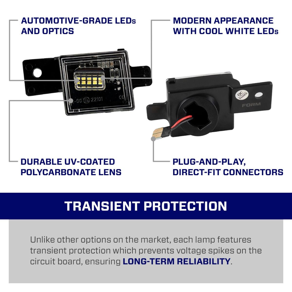 OEM-Grade Construction. Form Lighting License Plate Lights are built with quality in mind and constructed using OEM-grade materials, including a UV-coated polycarbonate lens, automotive-grade LEDs and optics, and direct-fit connectors. Unlike other options on the market, each lamp features transient protection which prevents voltage spikes on the circuit board, ensuring long-term reliability. While they may not be the cheapest option on the market, the fit and finish of our lamps are superior to other aftermarket units.