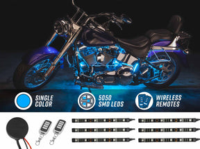 The Advanced Ice Blue Mini Motorcycle LED Kit features ultra-thin flexible lighting strips with surface mounted 5050 SMD LED technology. Select a 6pc kit all the way up to an 18pc kit. Each 6" motorcycle light strip is 1/8” thick and holds 6 SMD LEDs. They can be mounted virtually anywhere on the bike away from direct heat sources and moving parts.