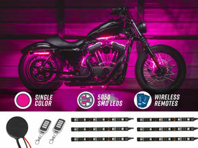 LEDGlow’s Advanced Pink LED Mini Motorcycle Lighting Kit illuminates your bike’s gas tank, frame rail or triple trees with a vibrant pink glow by utilizing ultra-bright, SMD LED technology housed in reduced-profile 6" mini strips. Showcase any bike at night with custom patterns combining spotless pink lighting and effects when you navigate features using one of the wireless remotes. With these motorcycle LED light kits you can transform the look of your bike with subtle, compact lighting strips and stand out when you’re riding after sundown.