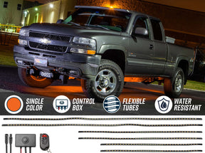 LEDGlow Flexible Slimline Orange Underbody Lights for Trucks deliver a spotless color spill that surrounds the bottom of your pickup with ultra-bright orange LED illumination. These expandable orange underglow lights for trucks feature flexible ultra-thin lighting tubes equipped with 5050 SMD LEDs. Included with each orange LED underglow kit are (2) 30” front and rear tubes, (2) 48” tubes for the sides and (2) 24” tubes for trucks with a larger wheel base. Secure the tubes with pre-applied adhesive tape that runs the length of the tubes in addition to mounting hardware provided. Use the handy 4-Button Wireless Remote to program custom lighting patterns combining orange lighting and effects. Transform the look of your truck with orange neon underglow anytime you hit the streets.