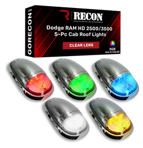 Upgrade the safety and style of your 2003-2018 Dodge RAM HD 2500/3500 Truck with the RECON 5-Piece Ultra Bright RGB Multi-Colored LED Cab Roof Light Kit. Comes with a complete wiring & hardware kit. Designed as a direct replacement for factory/OEM cab roof lights and can also be installed on models without factory cab lights. This high-performance kit enhances visibility in low-light conditions and harsh weather, ensuring you're seen when it matters most. Featuring ultra-bright RGB LEDs, it offers customizable color, pattern, strobing and brightness adjustments via a Bluetooth app for effortless control. Available in your choice of smoked or clear lens, this kit is built for durability and seamless installation, combining rugged functionality with a bold, modern look.